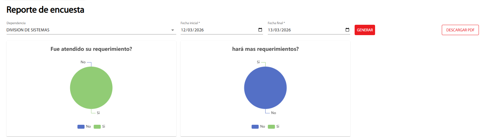 Al ingresar a este apartado el administrador podrá generar las respuestas de las encuestas según la dependencia que escoja, así mismo puede filtrarlas por fecha.