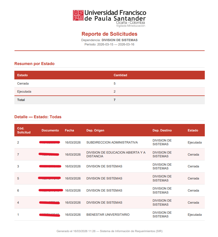Al ingresar a este apartado el administrador podrá generar las solicitudes según la dependencia que escoja, así mismo puede filtrarlas por fecha, y ver la información de las solicitudes de dicha dependencia., y podrá ver la información suministrada de esa solicitud.