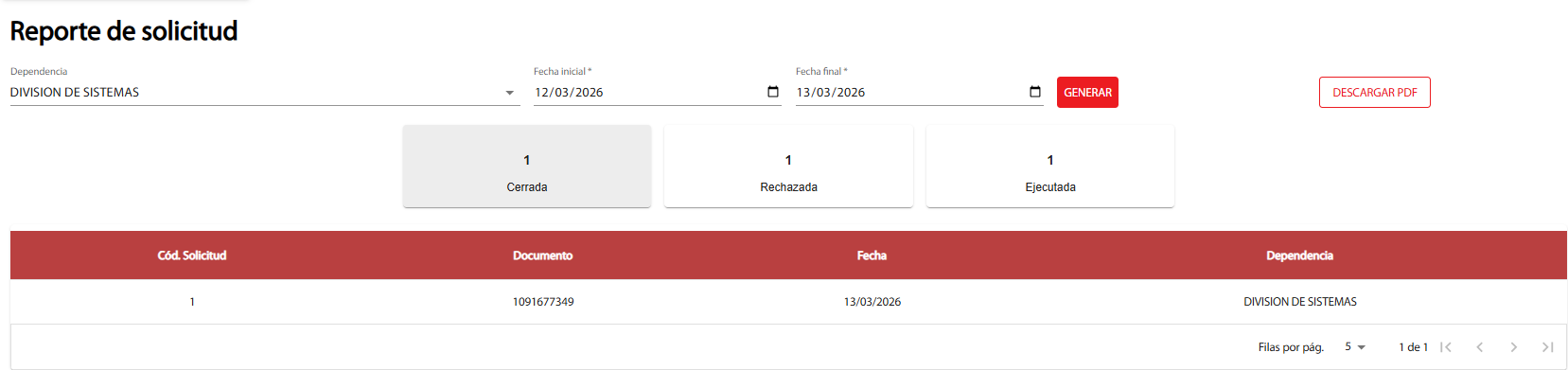 Al ingresar a este apartado el administrador podrá generar las solicitudes según la dependencia que escoja, así mismo puede filtrarlas por fecha, y ver la información de las solicitudes de dicha dependencia., y podrá ver la información suministrada de esa solicitud.
