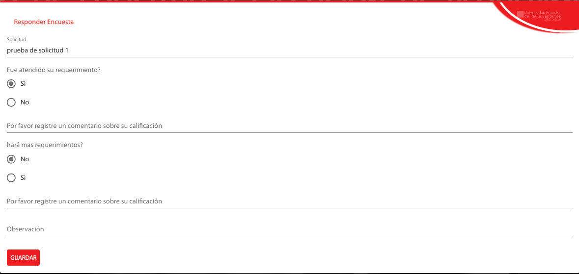 Una vez finalizado todo el proceso que conlleva un requerimiento, la única forma de que un requerimiento se cierre es que el solicitante responda una encuesta desde el mismo sistema, y puede hacer desde el home ingresando los datos para pedir otro requerimiento, al darle enviar, se generara la encuesta la cual debe responder, si no responde la encuesta, no podrá solicitar otro requerimiento.